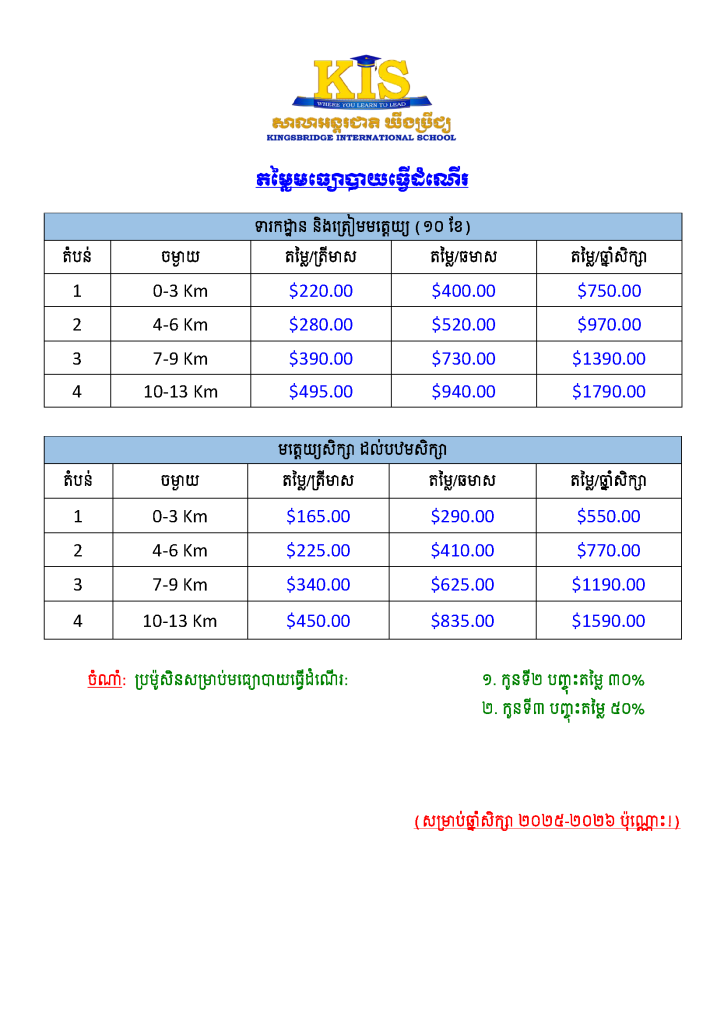 At KIS, we are committed to providing a safe and reliable transportation experience for every student. Our comprehensive school bus service covers all areas within Phnom Penh, ensuring that your child travels to and from school with ease and security.